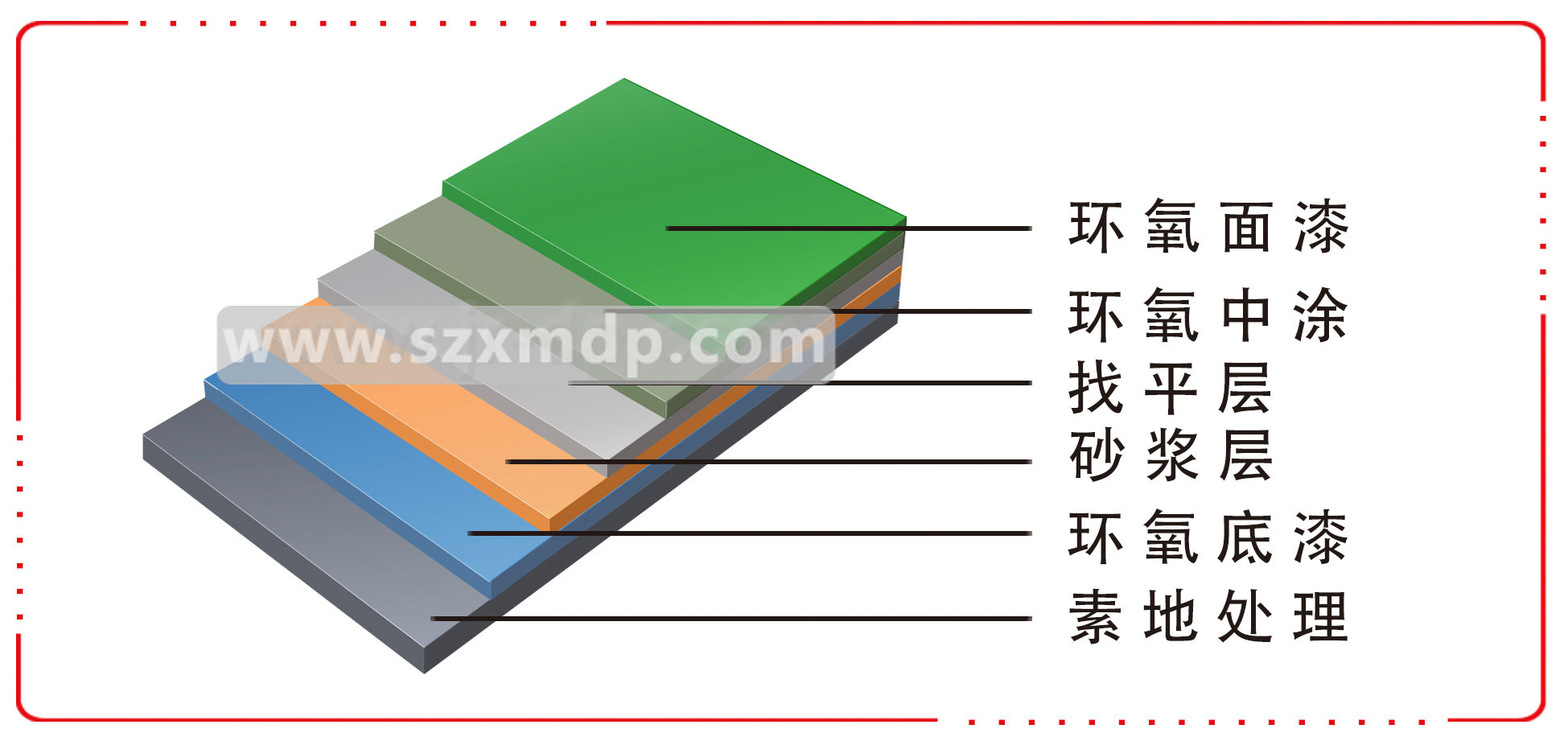 ![]() ◎ 選用無溶劑高級(jí)環(huán)氧樹脂加優(yōu)質(zhì)固化劑制成,無毒、無污染; ◎ 化學(xué)性能優(yōu)良,耐酸、堿、鹽、油類介質(zhì)腐蝕,特別耐強(qiáng)堿性能優(yōu); ◎ 平整光亮,可獲鏡面效果; ◎ 機(jī)械性能優(yōu)良,耐磨、耐壓、耐沖擊,有一定彈性; ◎ 施工快捷方便; ◎ 厚度2mm/8年,3mm/10年,4mm/12年,5mm/15年以上。 | ![]() 素地處理:打磨、吸塵處理: 底 涂:涂刷1-2遍環(huán)氧樹脂強(qiáng)滲透封閉底涂; 砂 漿 層:環(huán)氧樹脂中涂料調(diào)石英砂,用鏝刀或平刀抹刮,根據(jù)厚度要求可以多層施工; 找 平 層:再次打磨找平,進(jìn)行吸塵處理; 中 涂:批刮環(huán)氧樹脂中涂膩?zhàn)訉硬牧希?br style="box-sizing: border-box;"/>面 涂:用鏝刀將環(huán)氧樹脂自流平面漆鏝涂于中涂涂層之上 |